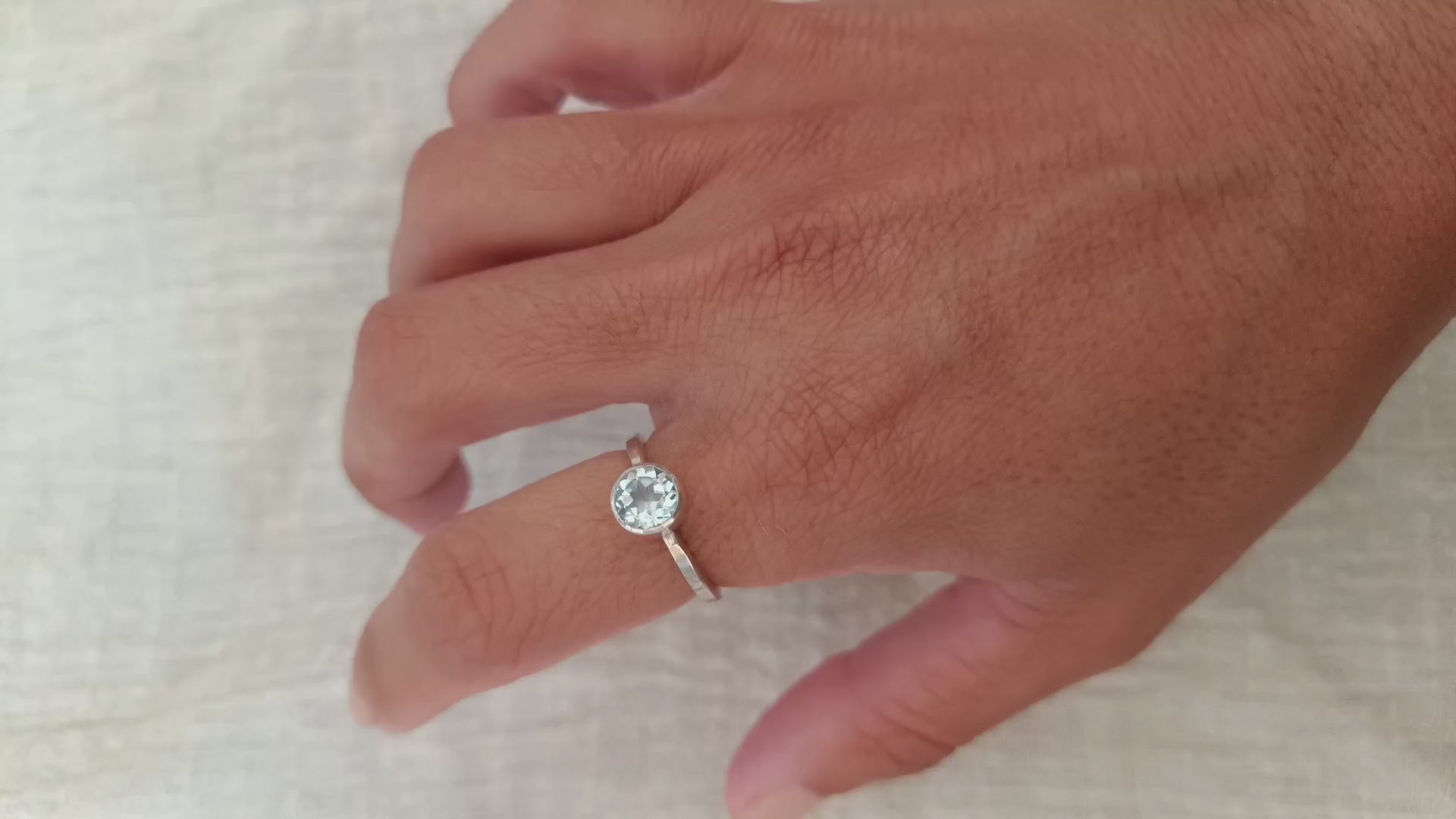 Con un estilo refinado, este anillo solitario presenta una aguamarina de gran tamaño que irradia luz y color. Su diseño minimalista permite que la piedra sea la protagonista absoluta, perfecto para ocasiones especiales.