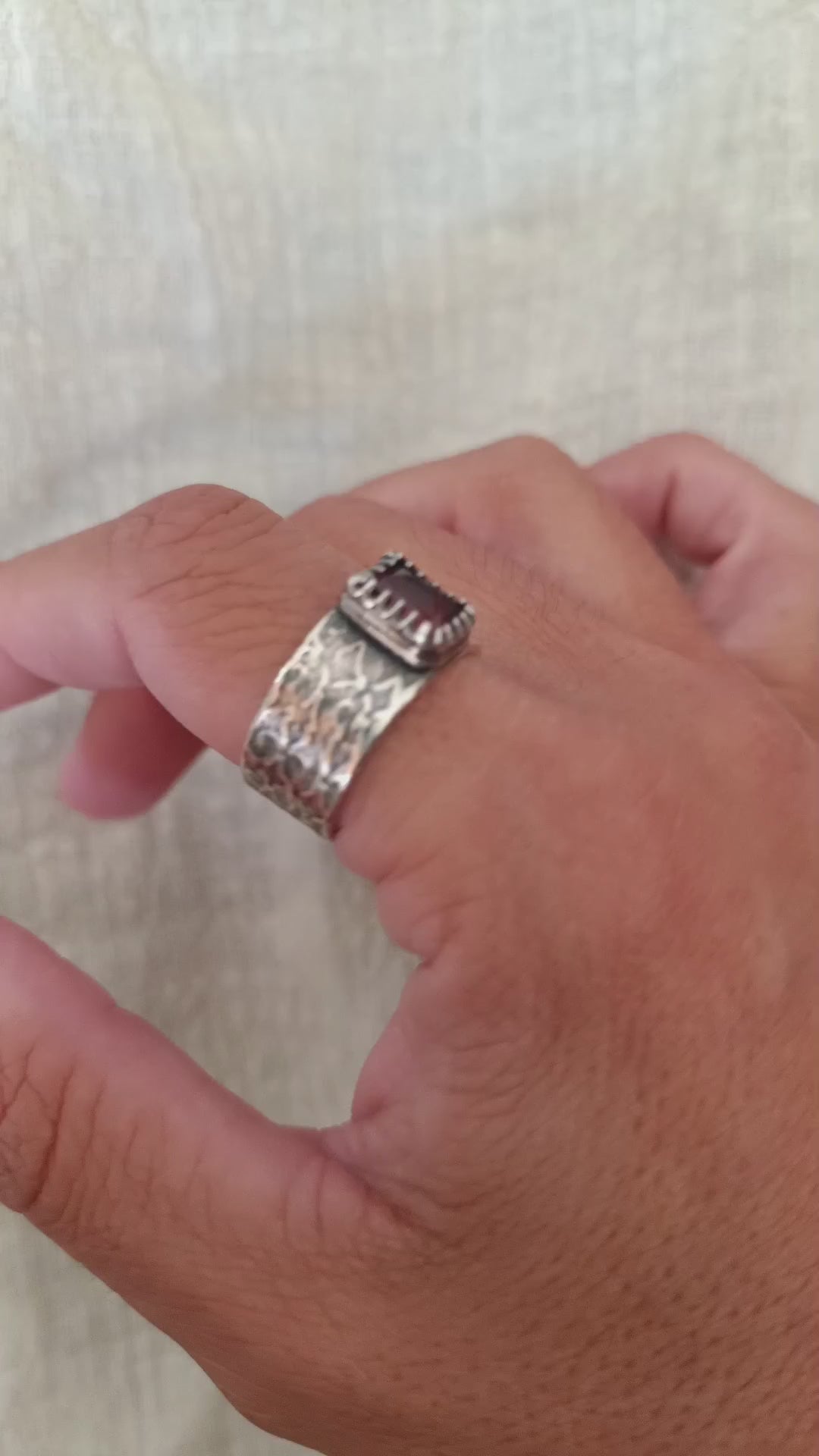 Anillo ajustable de plata con granate intenso y detalles texturizados en la banda. Su diseño cálido y elegante lo convierte en una pieza versátil, perfecta para destacar con estilo y sofisticación en cualquier ocasión.
