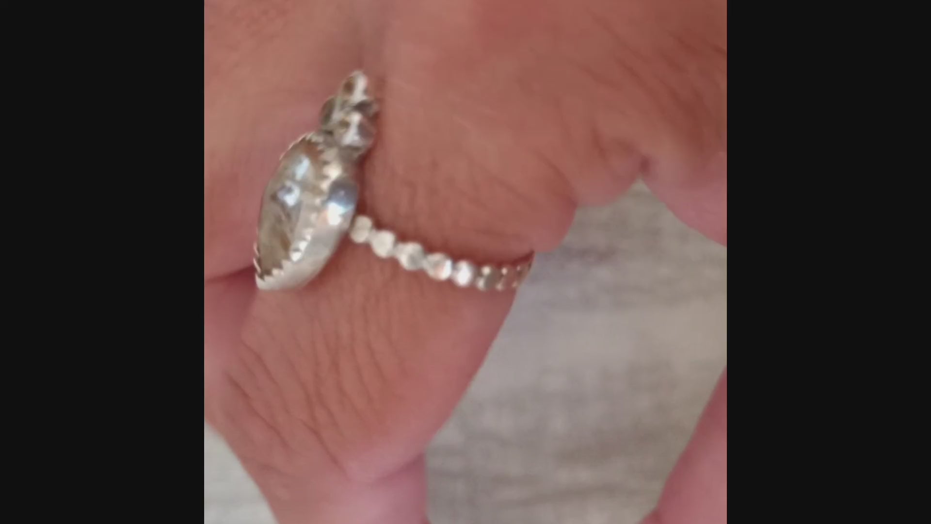 Anillo de plata con cuarzo rutilado dorado, cuyas delicadas vetas naturales crean un efecto único y luminoso. Acompañado de pequeños circones que aportan un brillo sutil, es una pieza cálida y elegante, perfecta para destacar con un toque especial.