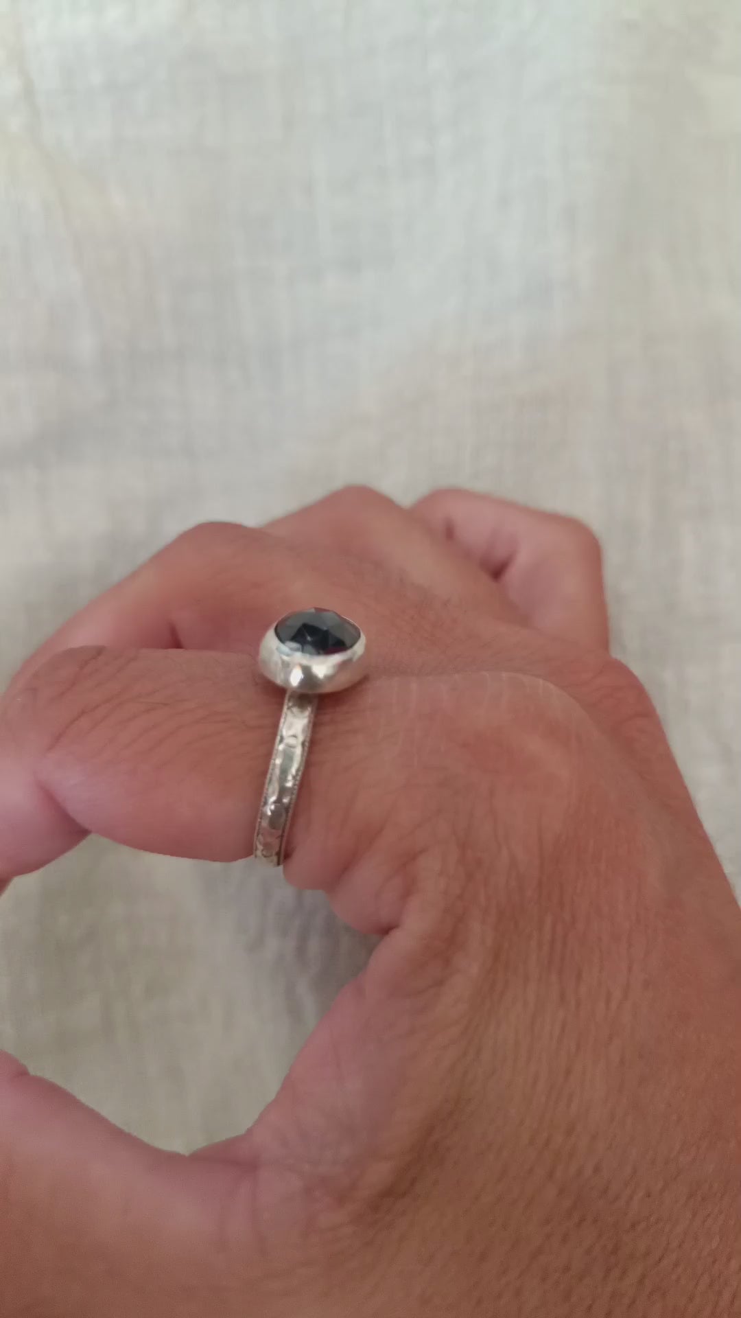 Anillo de plata con espinela negra ovalado facetado, de brillo profundo y envolvente. Su diseño clásico resalta la belleza de la piedra, creando una pieza con carácter, elegante y fácil de llevar en cualquier ocasión.